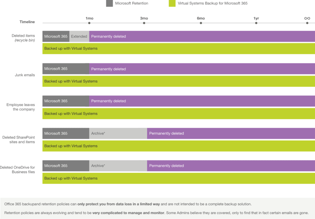Microsoft’s retention policies are limited. Deleted items are only recoverable for 30-93 days. Then, they’re gone forever.